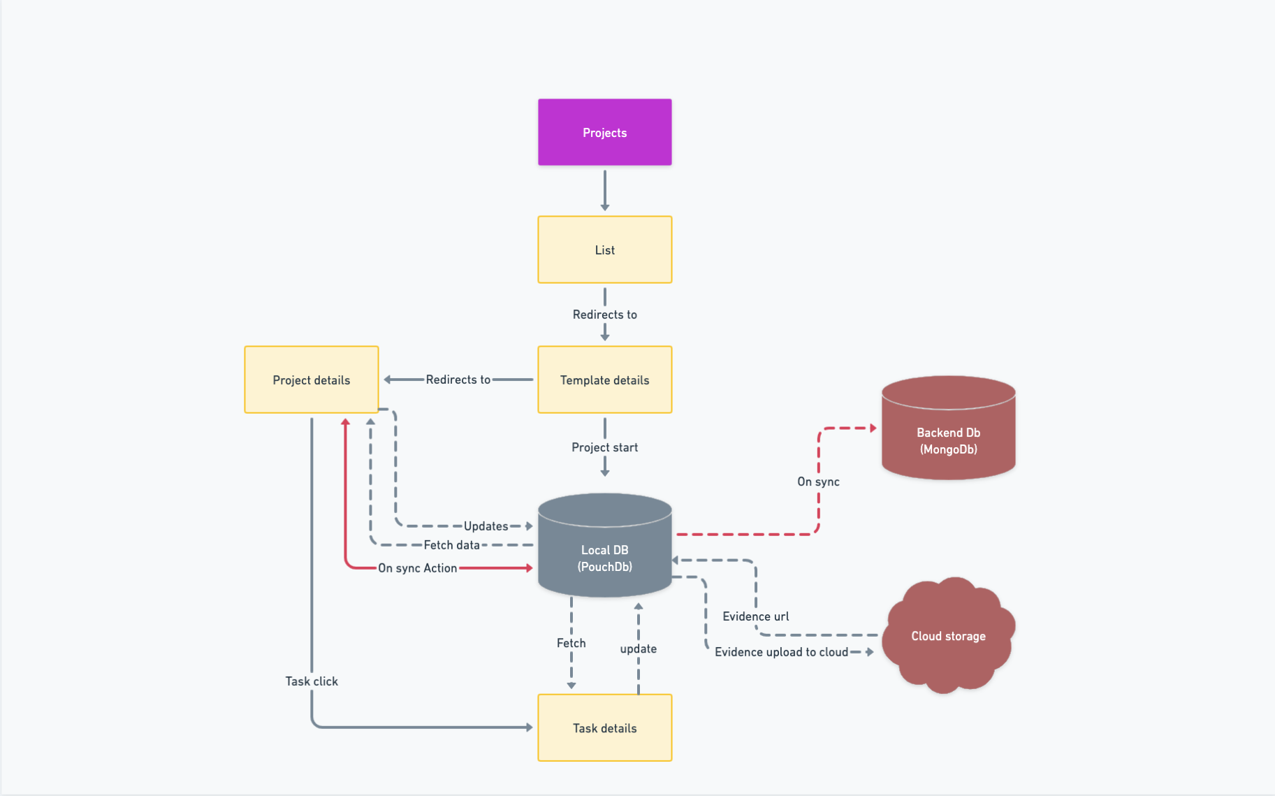 Before starting a project user will be taken to the Template page where all the details of the projects will be shown and the user will be able to start a project. On starting the project, the project will be saved into the Local db ie. PouchDb. All the started project will be kept local and only reaches the server on sync action. The user will be redirected to the project details page post starting the project.