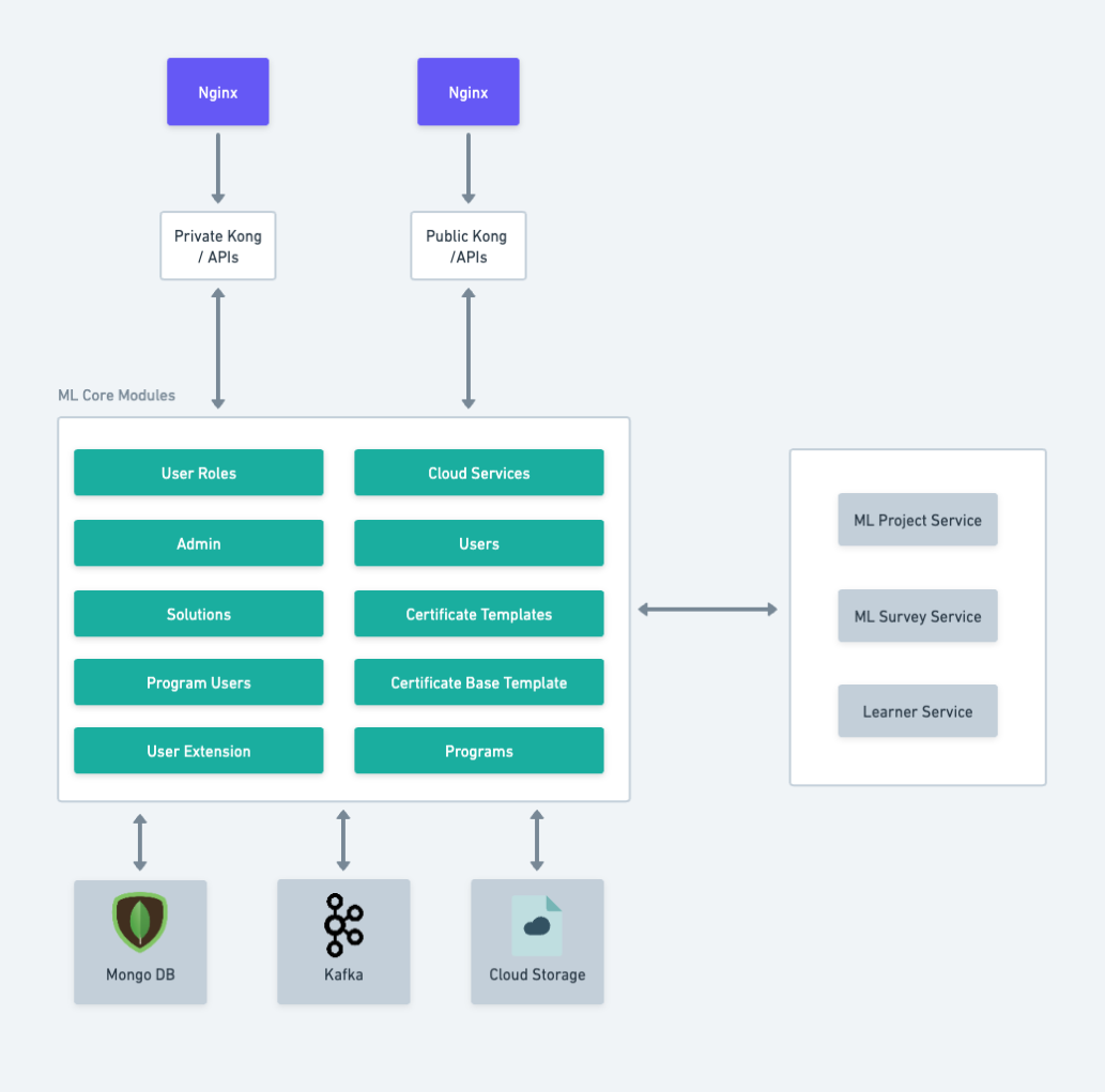 The ML Core Service is constructed using a MongoDB, Kafka, and cloud storage technologies. Additionally, it seamlessly collaborates with vital services like [ML Project Service](https://ed.sunbird.org/use/source-code/manage-learn/ml-project-service), [ML Survey Service](https://ed.sunbird.org/use/source-code/manage-learn/ml-survey-service), and [Learner Services](https://lern.sunbird.org/learn/readme). This Microservice is composed of ten pivotal Modules, each playing a crucial role.
