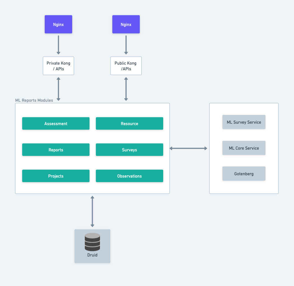 The ML Reports Service is constructed using a Druid as a data source. Additionally, it seamlessly collaborates with vital services like ML Survey Service, ML Core Service, and Gotenberg. This Microservice comprises six pivotal Modules, each playing a crucial role.