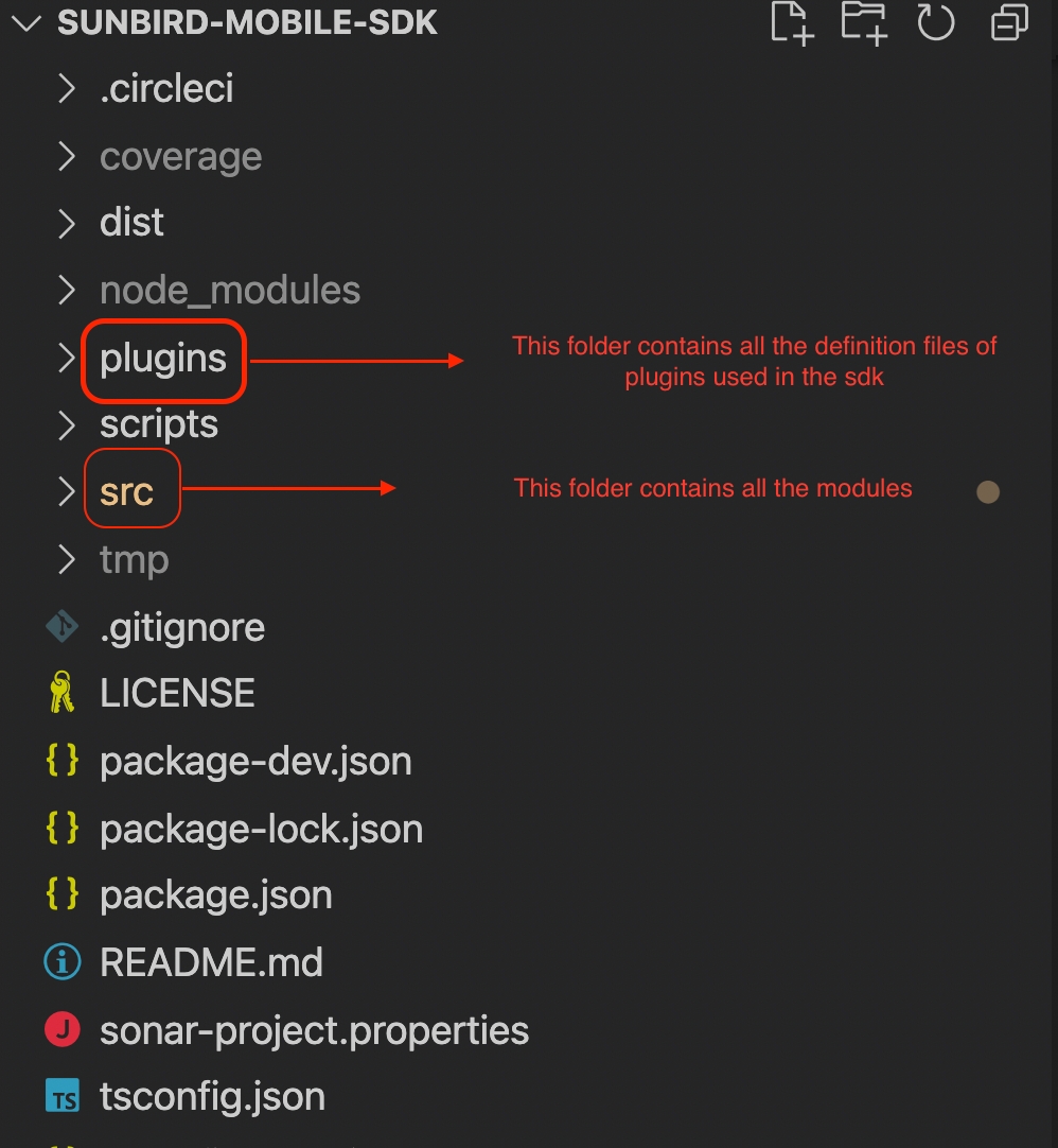 The sunbird-mobile-sdk follows a basic typescript library code structure that is modular. The following diagram shows the folder structure of the SDK.